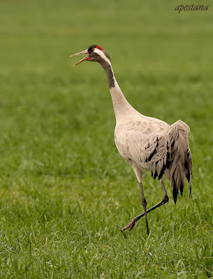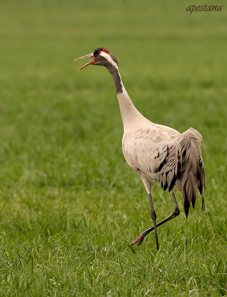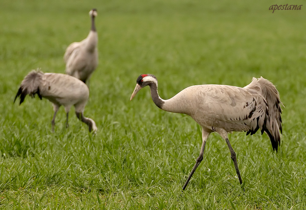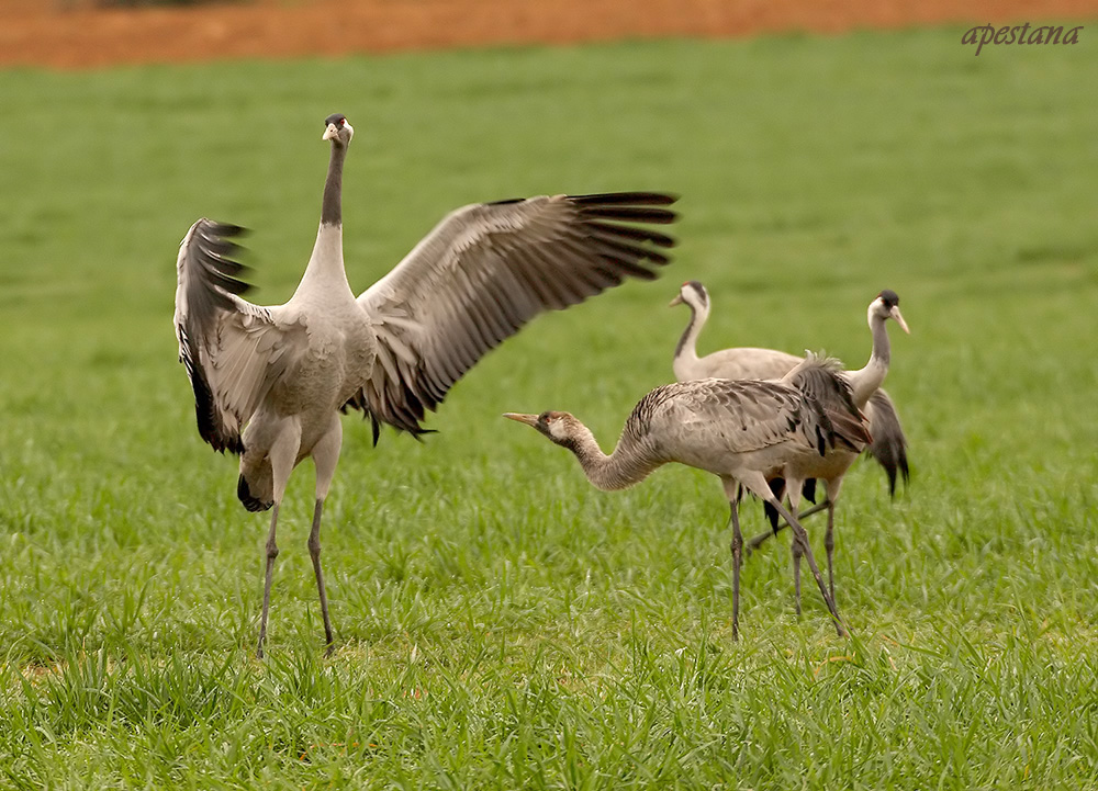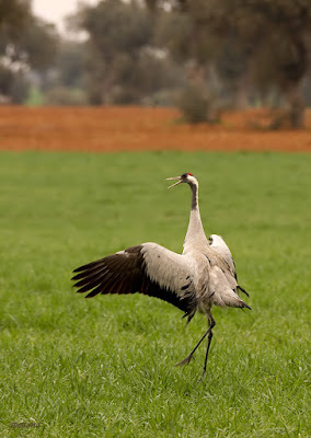 Su escandaloso trompeteo es uno de los sonidos más característicos de las dehesas durante el invierno, donde acuden huyendo de los fríos del norte a comer las bellotas de nuestras encinas. Es fácil ver las formaciones de grullas en “V” cuando se desplazan de un lugar a otro.